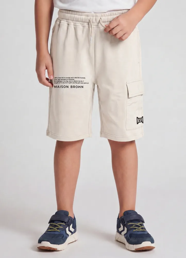 Cotton mix drawstring sweat shorts with one nylon cargo pocket featuring a heart full of courage print.