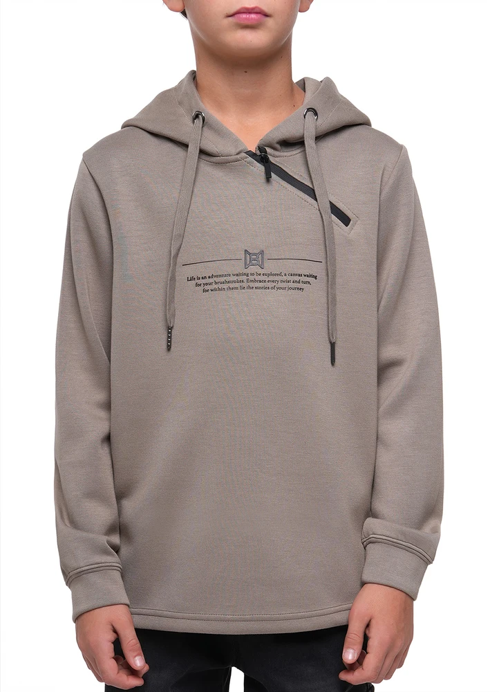 Sweatshirt Hood.Rayon hooded half diagonal zip sweatshirt with life is an adventure print.50% Rayon, 45% Polyester,5% Spandex.