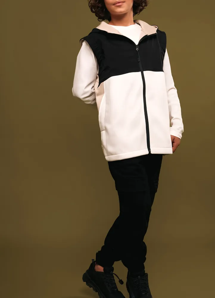 Sweatshirt Cardigan.Tricolor bimaterial hooded sleeveless full zip sweatshirt.56% Cotton, 44% Polyester.