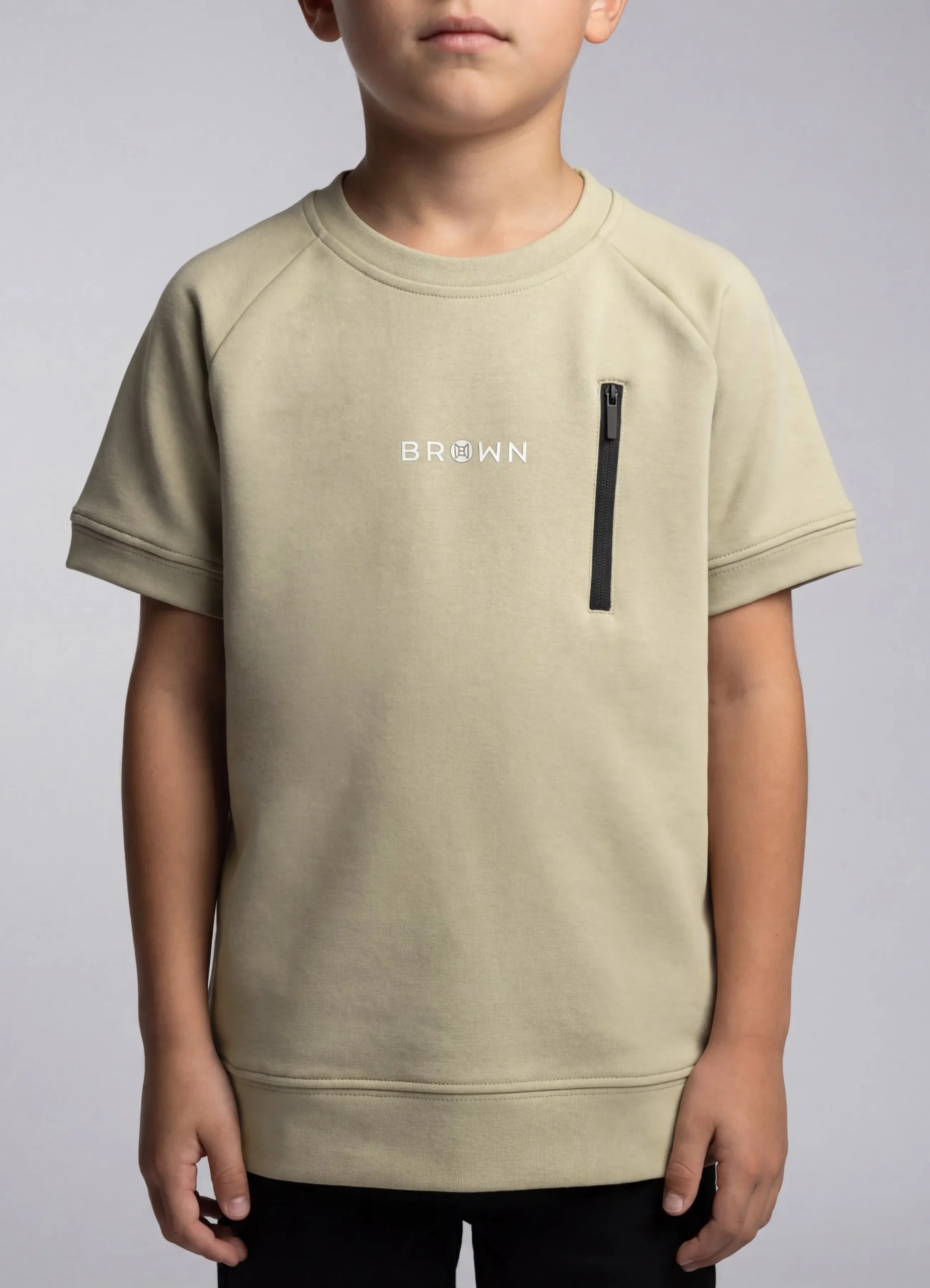Oversized short sleeve sweatshirt with Brown and vertical zip on chest.