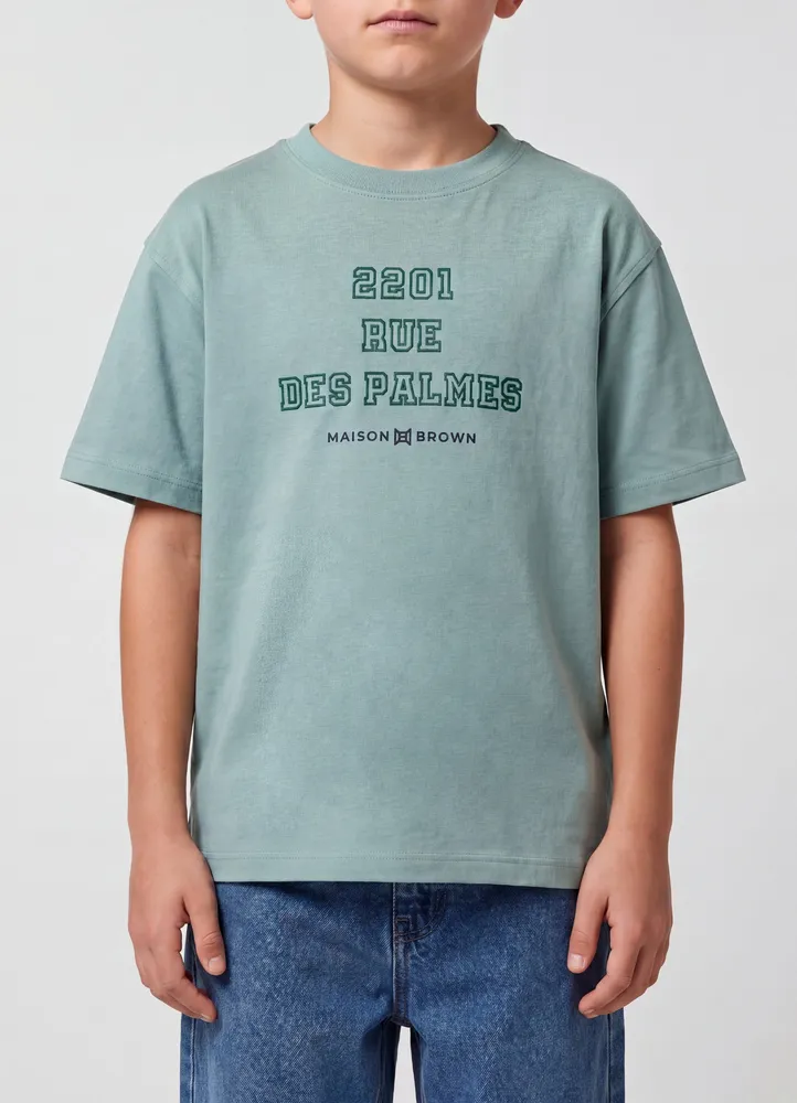 2201 rue des palmes Maison Brown printed t-shirt with small badge on back.