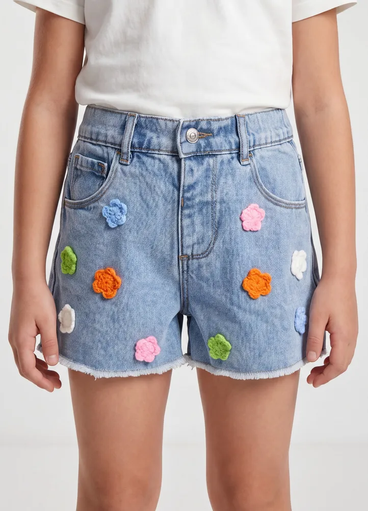 Light denim mini shorts with crochet colorful flower crochet patches and ripped hem.