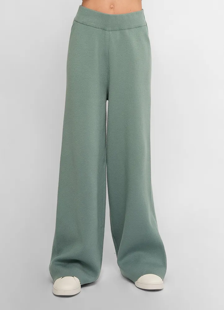 Sweat Pants.Knitted wide leg elastic waist pants.30% Polyester, 27% Acrylic, 26% Viscose, 17% Nylon.