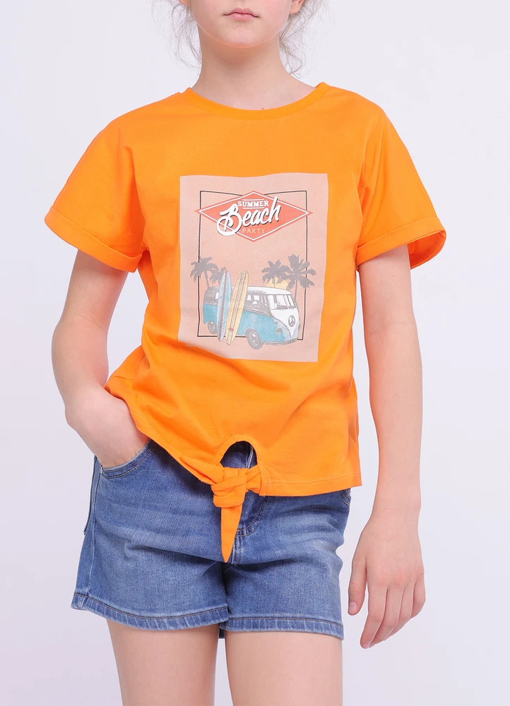 T-Shirt SS.Summer beach party surf van printed t-shirt with tie on bottom.100% Cotton.