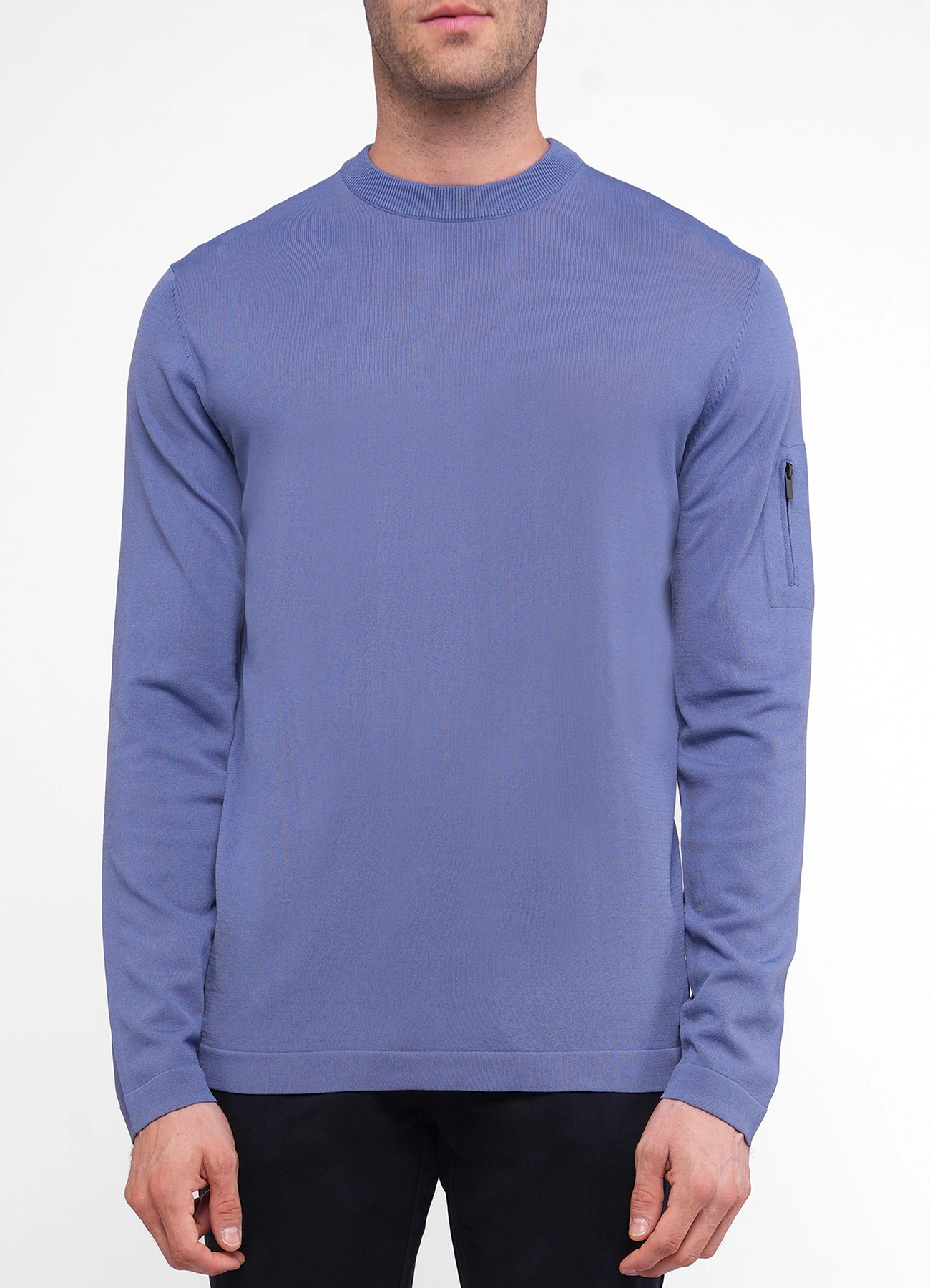 Jamil technical fabric cew neck stretch knit sweater with zipped pocket on sleeve and open bottom.