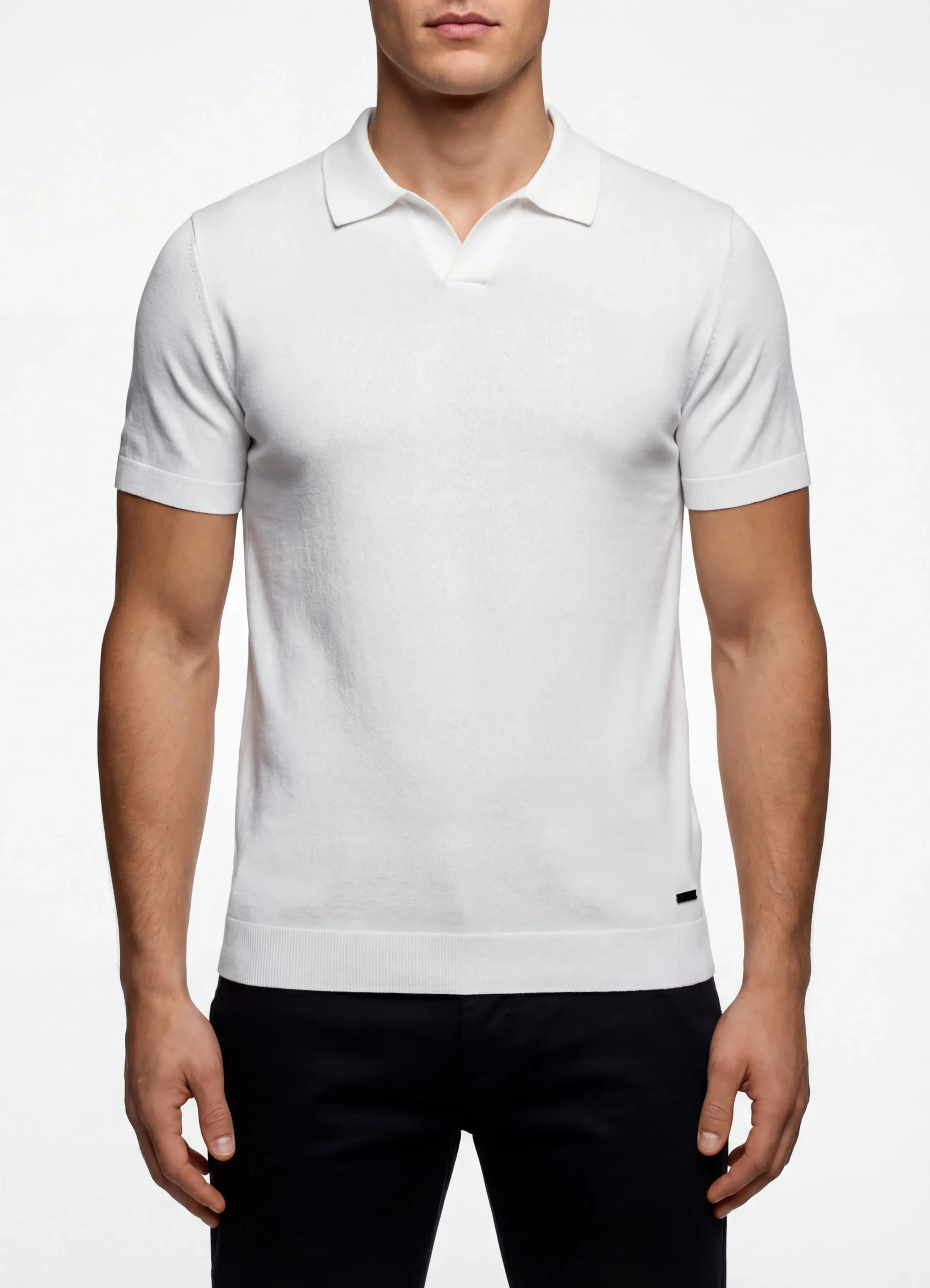 Technical plain v-neck knitted poloshirt with Maison Brwon metal on bottom.