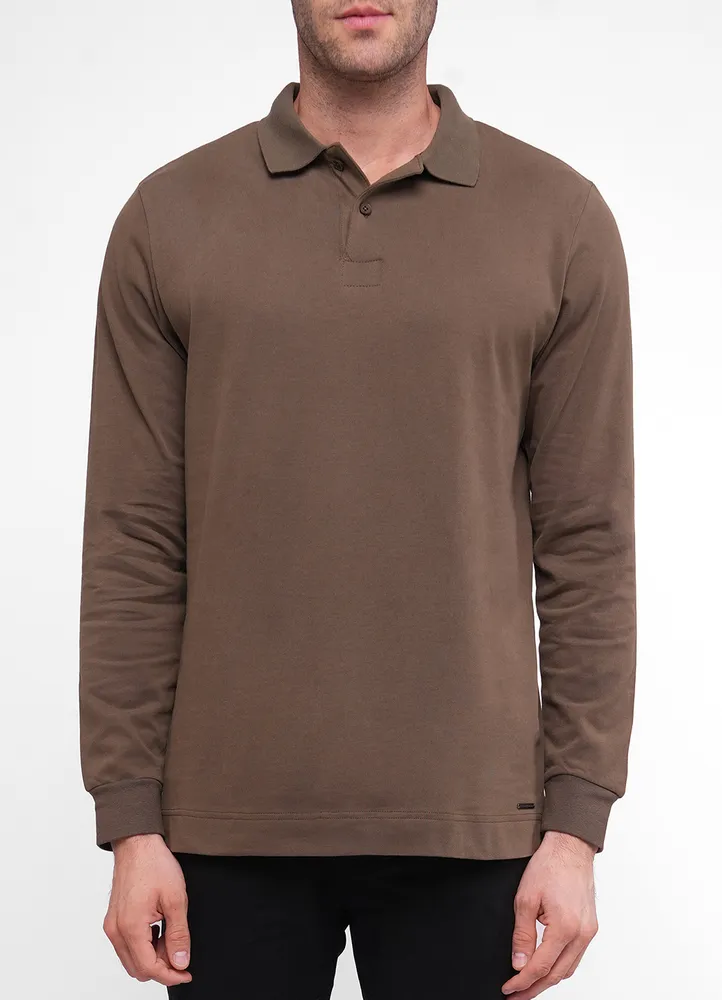 Plain basic jersey long sleeve poloshirt with Maison Brown metal branding on bottom.