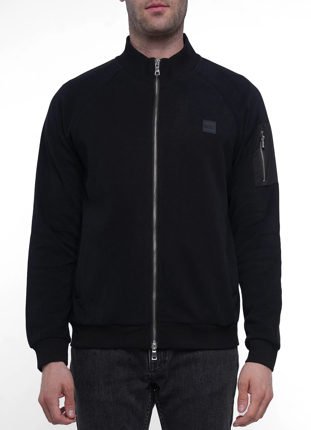 Plain two way full zip sweatshirt with nylon zipped pocket on arm featuring Maison Brown square rubber badge on chest.