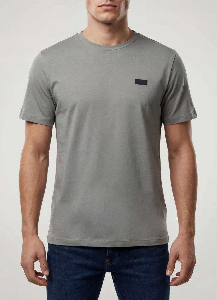 Plain crew neck short sleeve t-shirt with Maison Brown rectangular rubber badge on chest featuring four pictures mountain back print.
