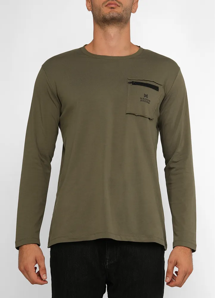 T-shirt with raw chest pocket and zip contrast featuring Maison Brown on it.