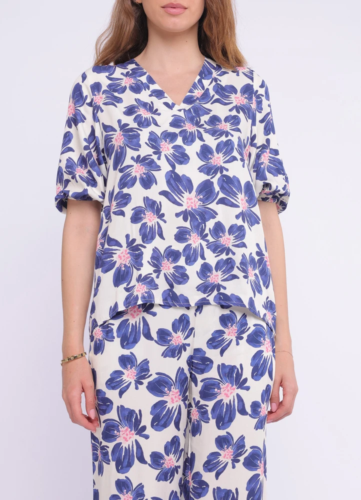This short-sleeve crossed V-neck blouse features an all-over floral print, balloon sleeves, and opening details at the back for a unique touch.