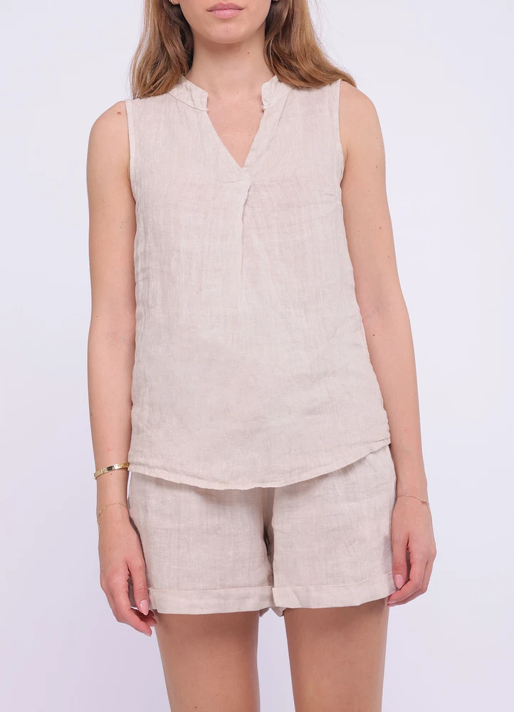 This short-sleeve v-neck blouse is made from soft, breathable linen, offering a simple and stylish design for a chic look.