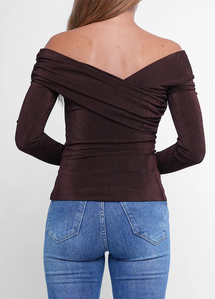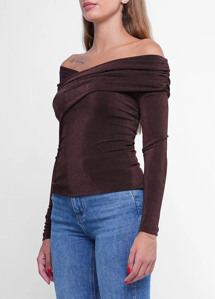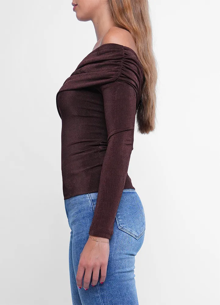 Long sleeves, off-shoulder top with asymmetric neckline and draped fabric detail.
