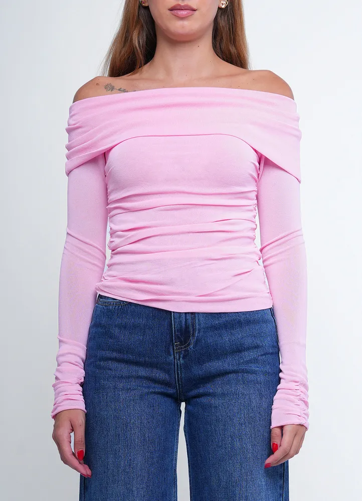 Long sleeve off-shoulder top with turn-up detail at the neckline and subtle gathering on the sides.