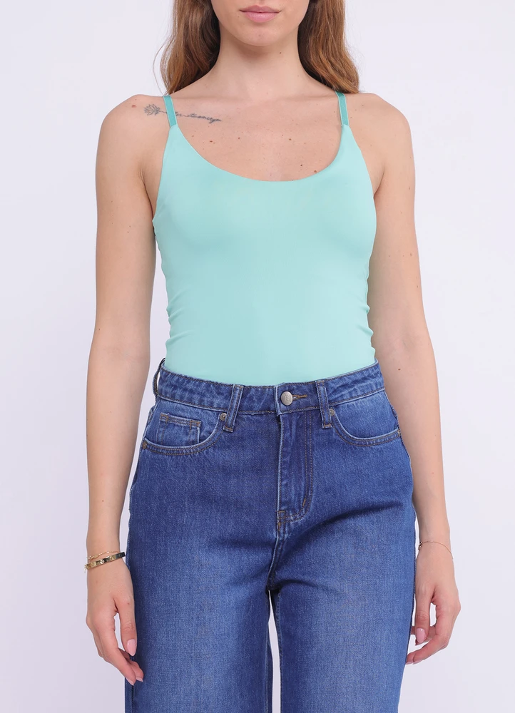 This V-neck bodysuit features thin adjustable straps and a snap-button fastening at the bottom for a secure and comfortable fit.