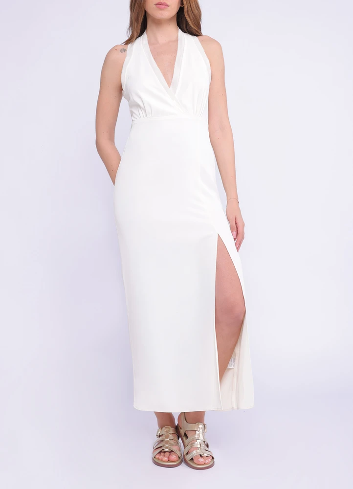 This V-neck maxi dress features a semi-sheer fabric, self-fabric belt, and a slit at the hem for added movement.