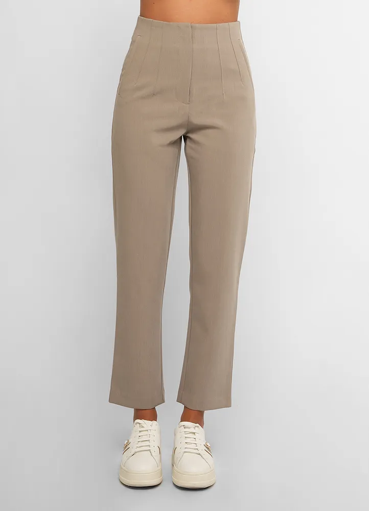High waist dress pants featuring seam detail on the front and back, front welt pockets, front zip fly, inside button and metal hook fastening.