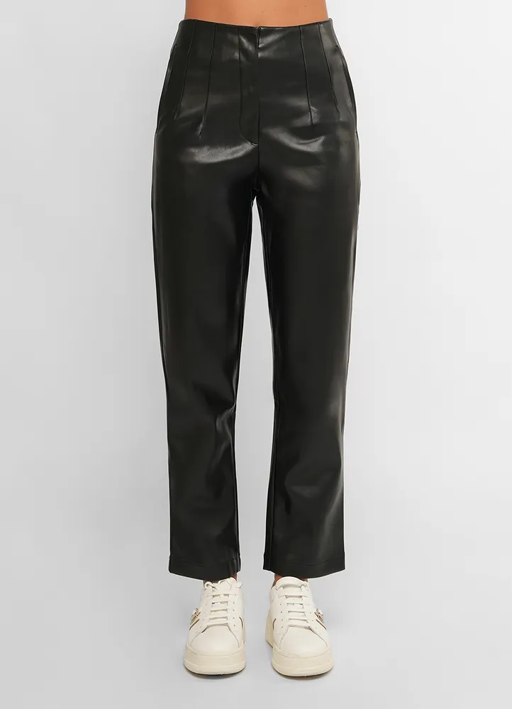 High-waist PU dress pants featuring seam detail on the front and back, front welt pockets, front zip fly, inside button and metal hook fastening.