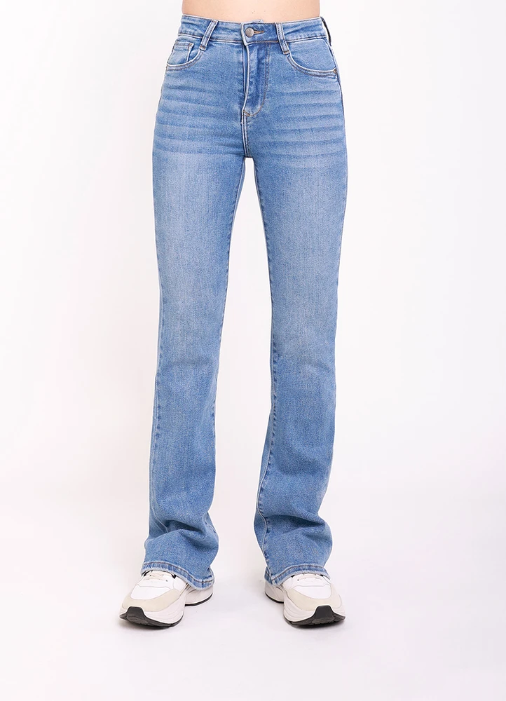 Skinny fit, high waist, flared leg jeans.