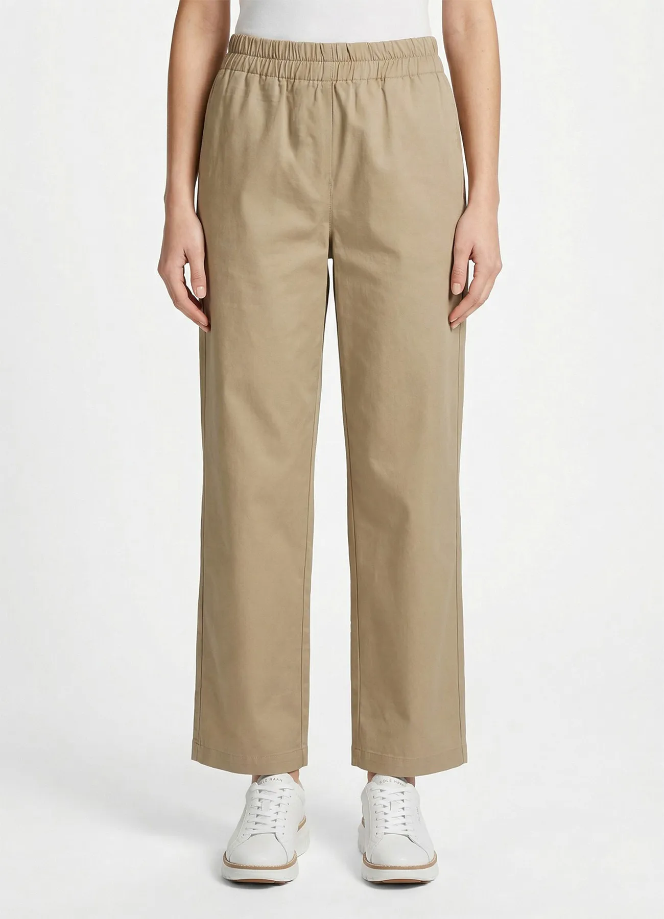 High waist cropped pants featuring elastic waistband and side pockets.