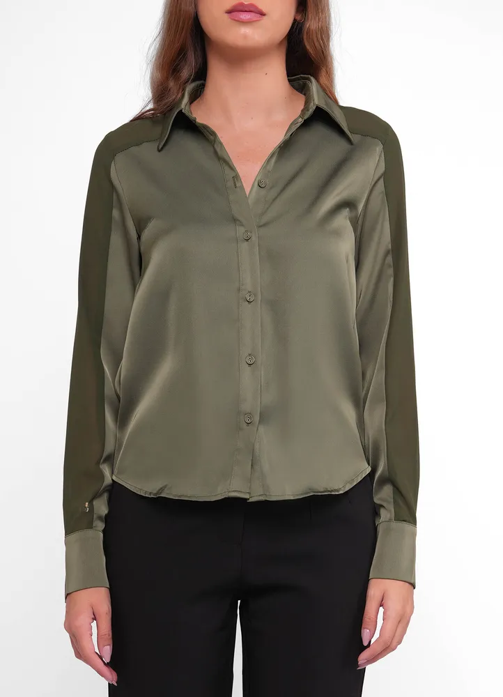 LS shirt in satin and semi sheer fabric,This shirt is perfect for both formal and casual occasions.