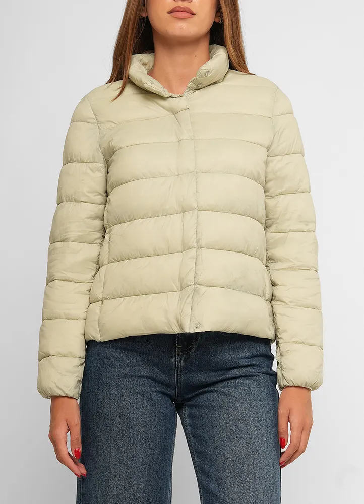 Stay cozy and stylish with this warm and lightweight doudoune short jacket featuring both button and zip closures.