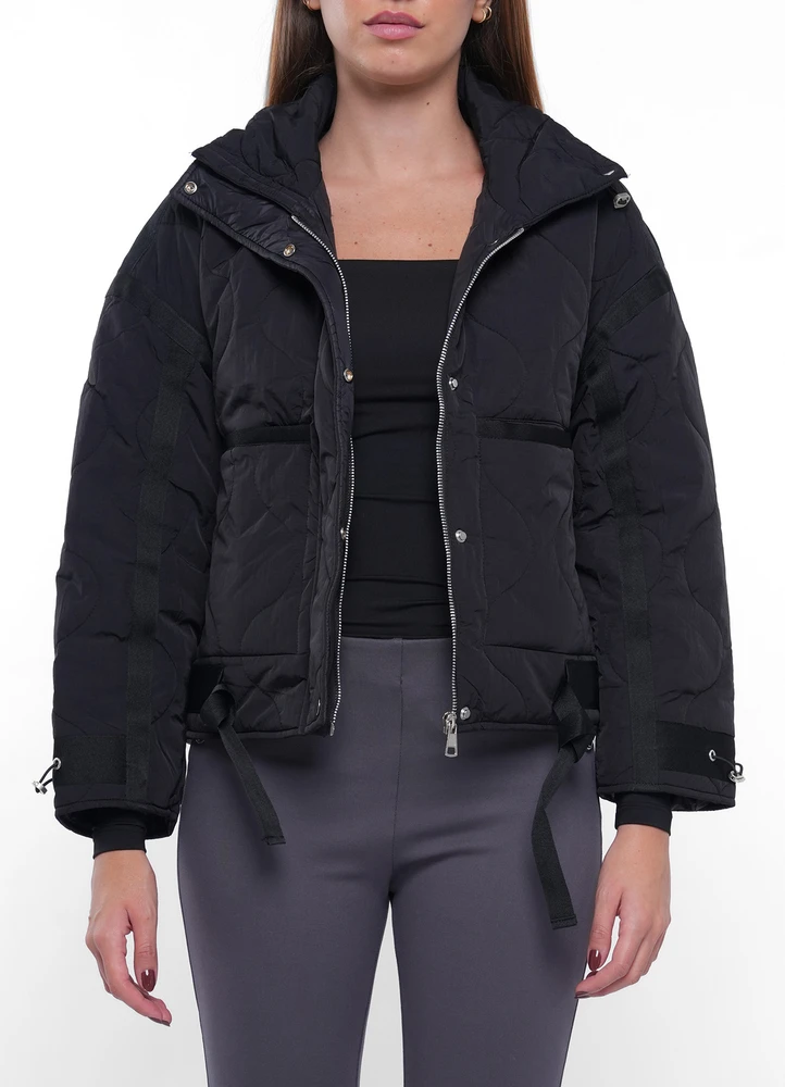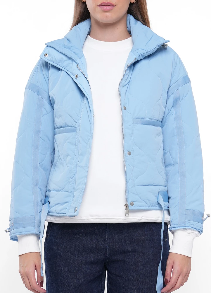 Short Quilted nylon Jacket with patch pockets and with ribbon belt drawstring and with full zip closure.