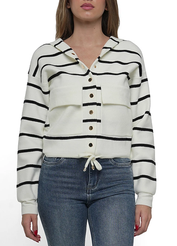 Hooded sweatshirt with flap pockets in the front and gold buttons closure and black stripes.