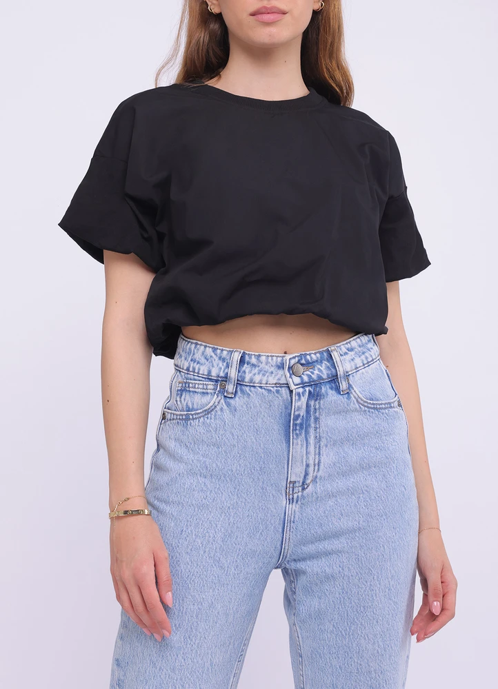 This cropped T-shirt features a ribbed round neck, short puff sleeves, and a puff elasticated hem for a playful silhouette.