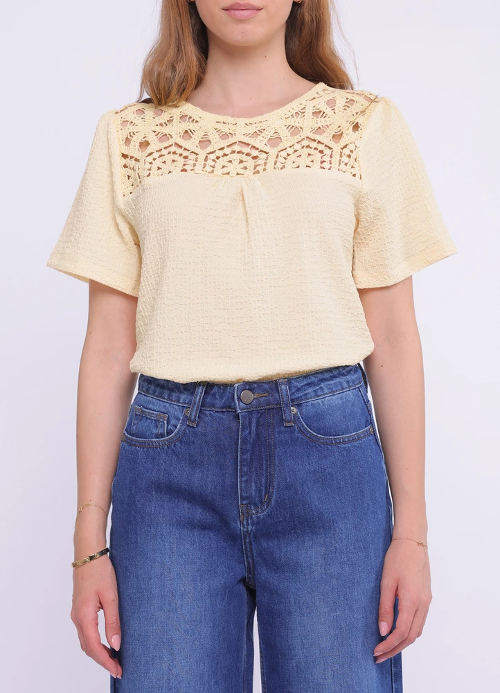 This short-sleeve crew neck blouse features a textured fabric and a crochet detailing on the yoke for a stylish touch.