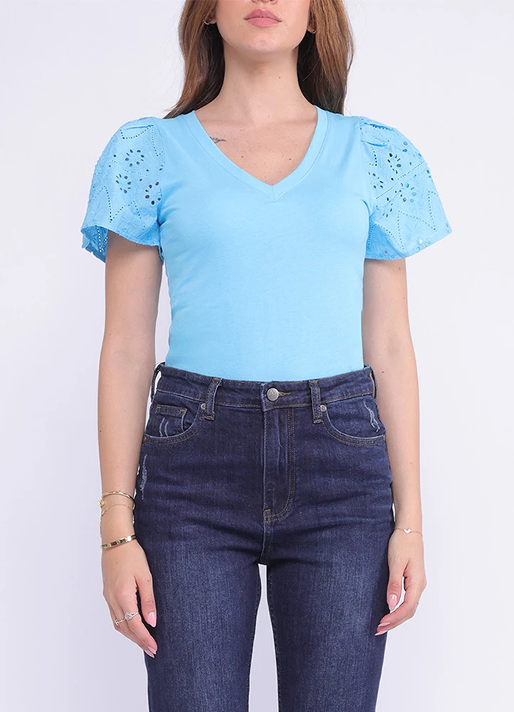 Short-sleeve V-neck t-shirt featuring openwork detail on the sleeves for added style.