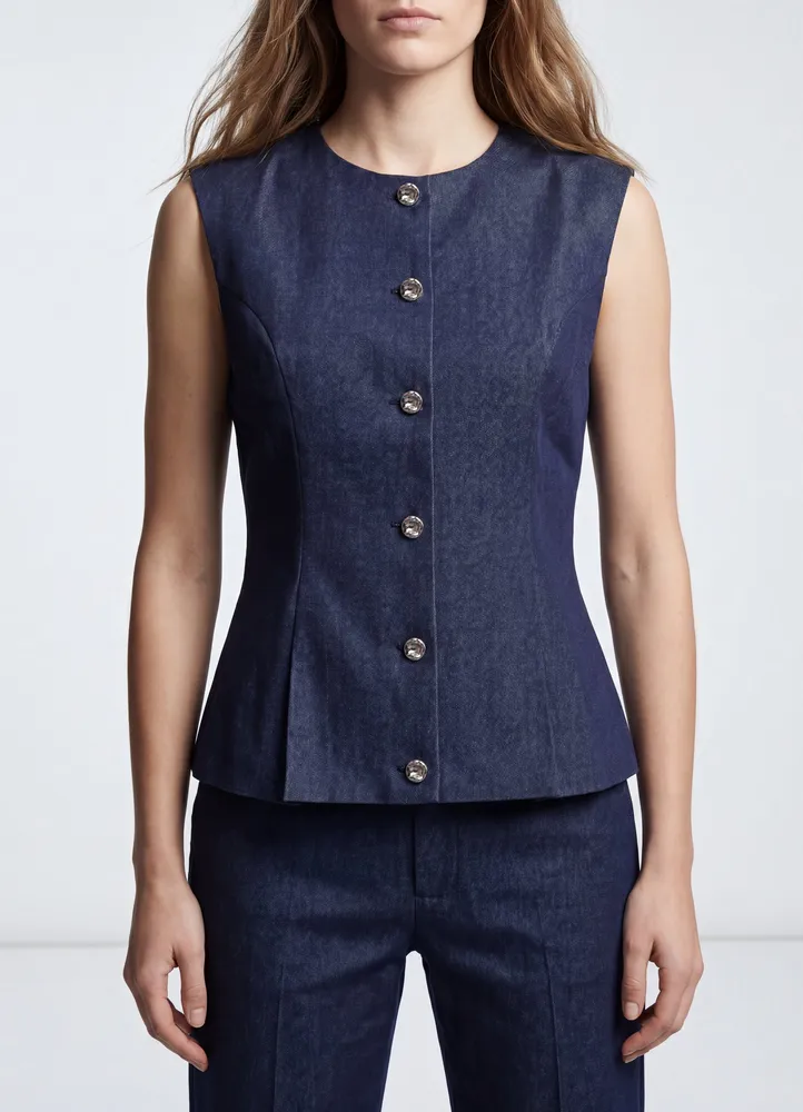 Fitted linen waistcoat with darts at the waist. Front button fastening.