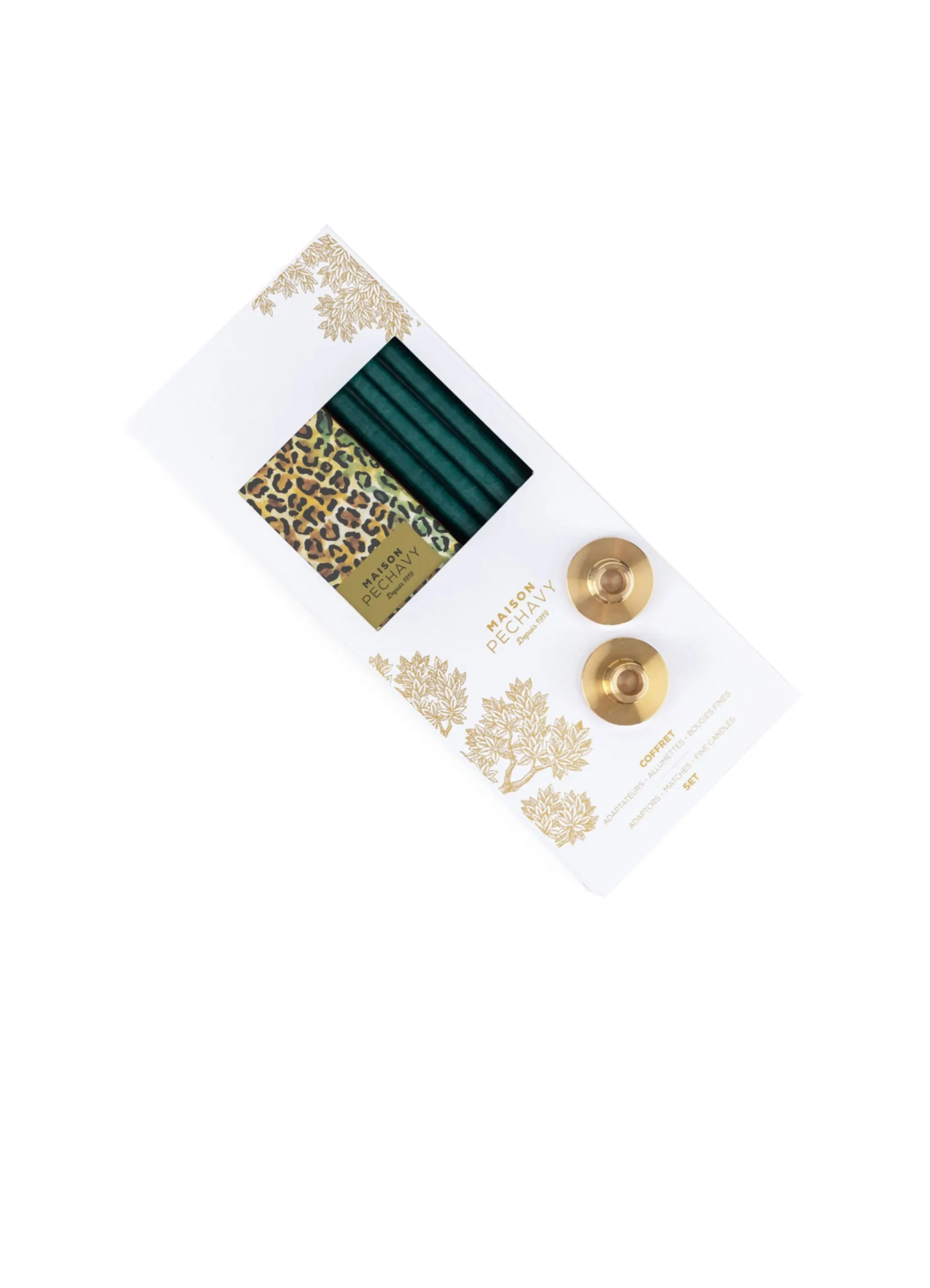 SET OF BRASS CANDLE HOLDERS, FINE CANDLES, AND MATCHES, FEATURING 10 HANDMADE CANDLES, 30 CM HEIGHT, 0.8–1 CM BASE DIAMETER, 40 LONG MATCHES, AND TWO SOLID BRASS ADAPTER CANDLE HOLDERS, MALACHITE (10 VERT MALACHITE)
