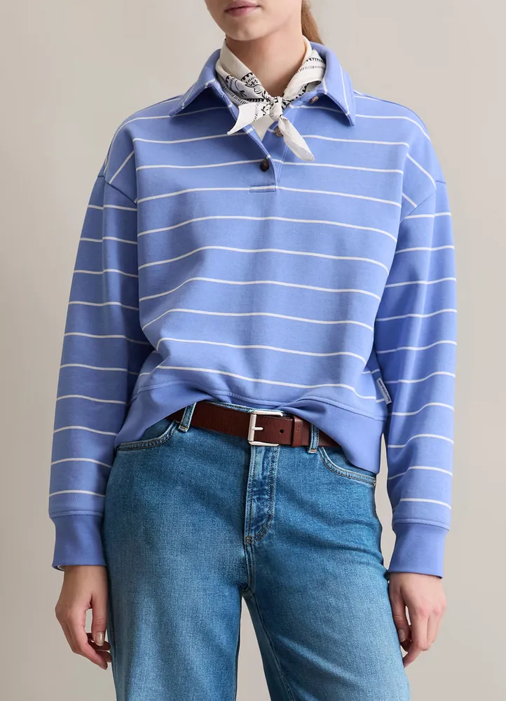 The striped polo sweatshirt from Marc O’Polo DENIM is a new, stylish alternative to the classic hoodie. It is a casual jersey sweater with a collar, ribbed cuffs and button placket, which makes an ultra-sporty yet elegant impression. Styling tip: Make sure you wear it with the button placket open and let a T-shirt, long sleeve or striped blouse peek out from underneath. This gives the outfit an exciting depth. Our polo sweater is made from pure, yarn-dyed cotton with a cosy inside and has a loose, cropped fit with dropped shoulders.