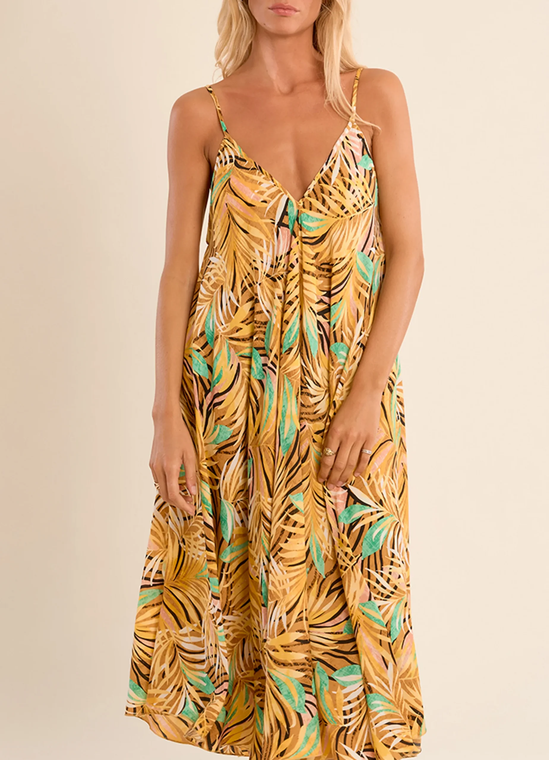 This long, flowing dress features a vibrant Yellow Claudia print and an asymmetrical hem for a dynamic, elegant look. Thin adjustable straps and a V-neckline at both the front and back add a flattering, feminine touch. Main Fabric: 100% Polyester