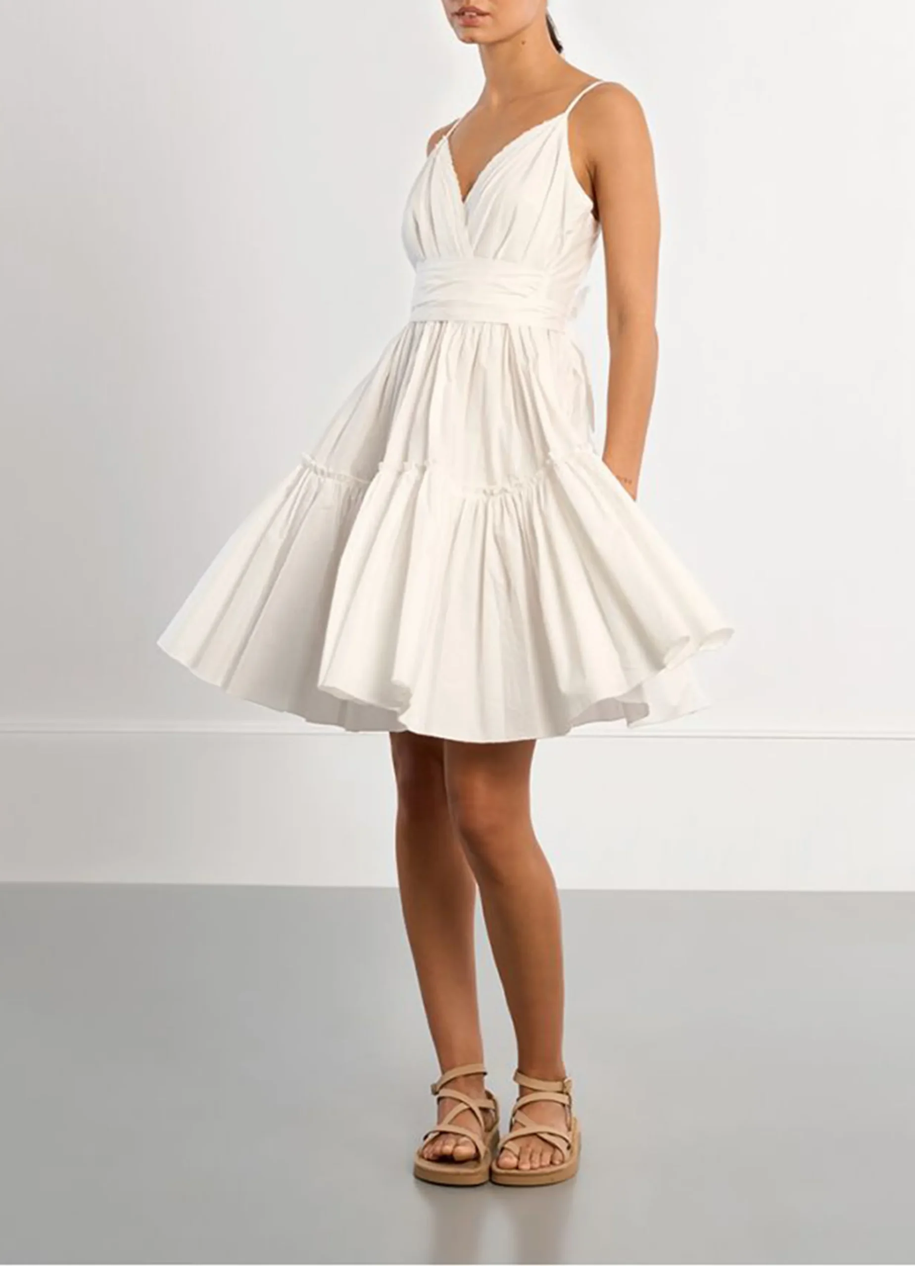 This short flared dress features thin adjustable straps and a flattering crossed V-neckline for a feminine silhouette. Designed with a tie belt that defines the waist, it enhances the figure while maintaining a light, airy feel. Multi-ruffle detailing at the hem adds movement and a playful touch, making it perfect for warm-weather occasions.