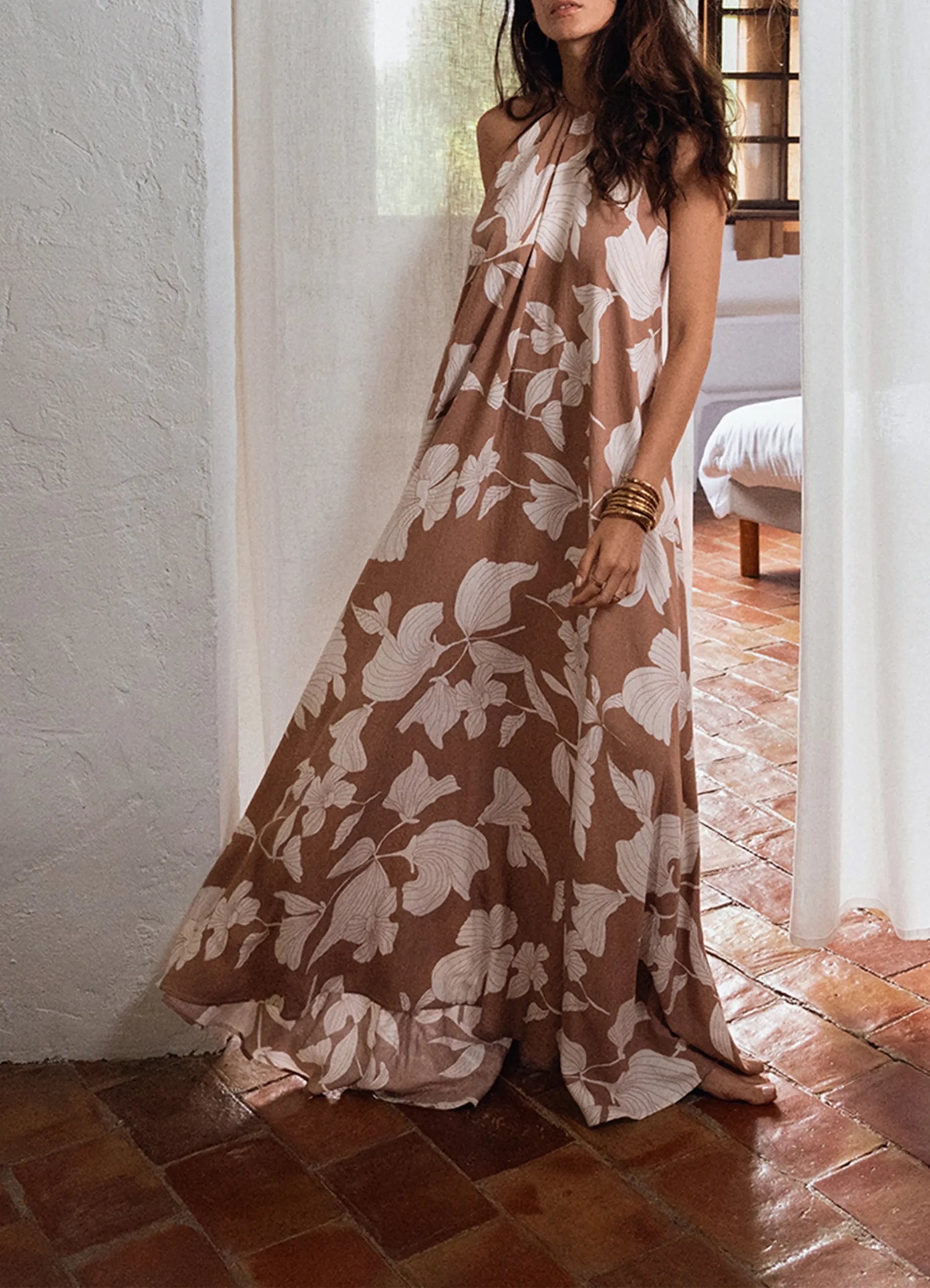 This long printed dress features a halter neckline that ties elegantly behind the neck, creating a refined and feminine look. The scoop shoulder design adds a soft, flattering touch, while the straight, loose fit ensures comfort and effortless movement. Perfect for warm days or relaxed occasions, it blends style with ease.