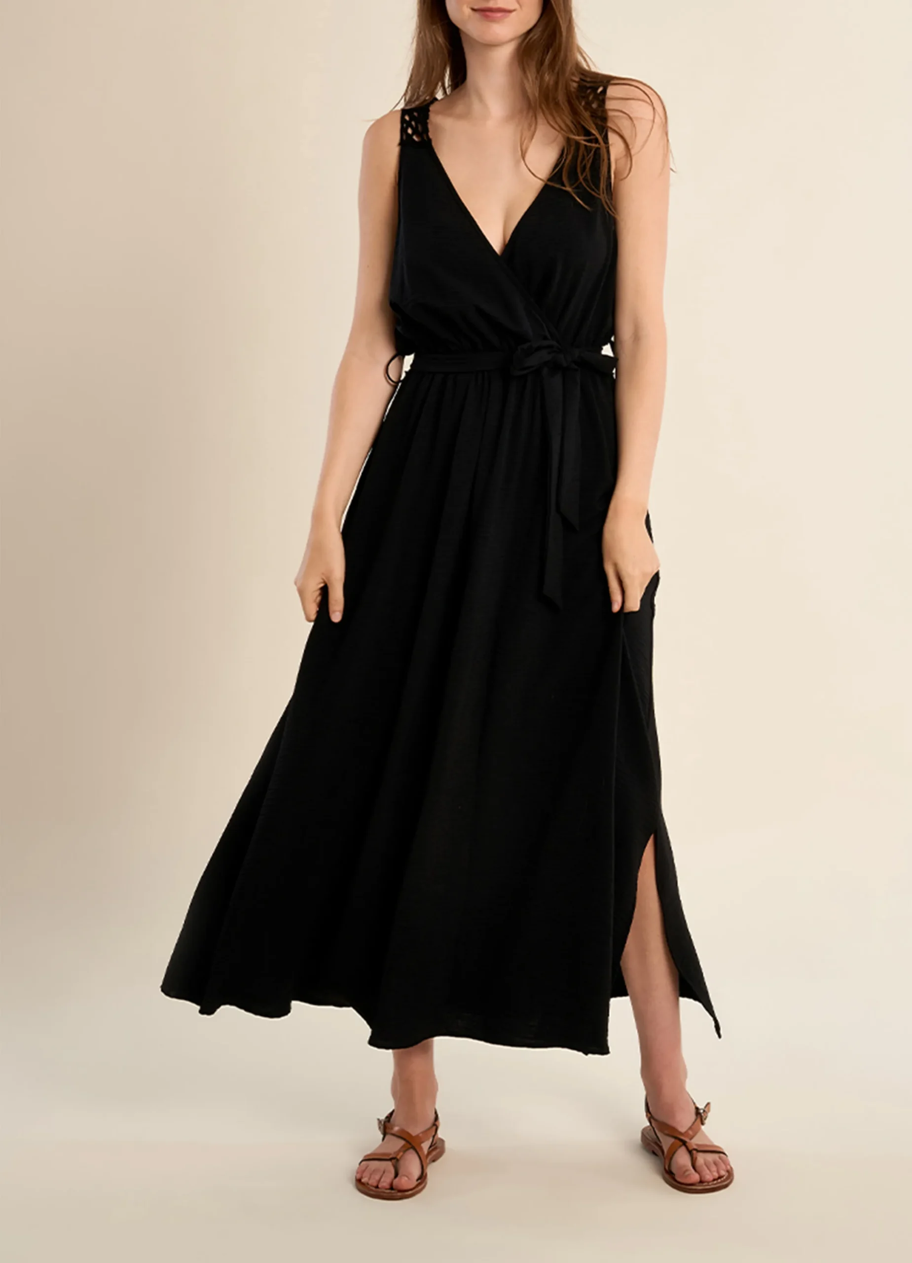This long dress features a flattering V-neckline and a belted waist that enhances the silhouette. Designed with delicate embroidered straps and an openwork back detail, it brings a feminine and refined touch. The fluid shape ensures elegant movement, making it a perfect choice for special occasions or elevated everyday styling.