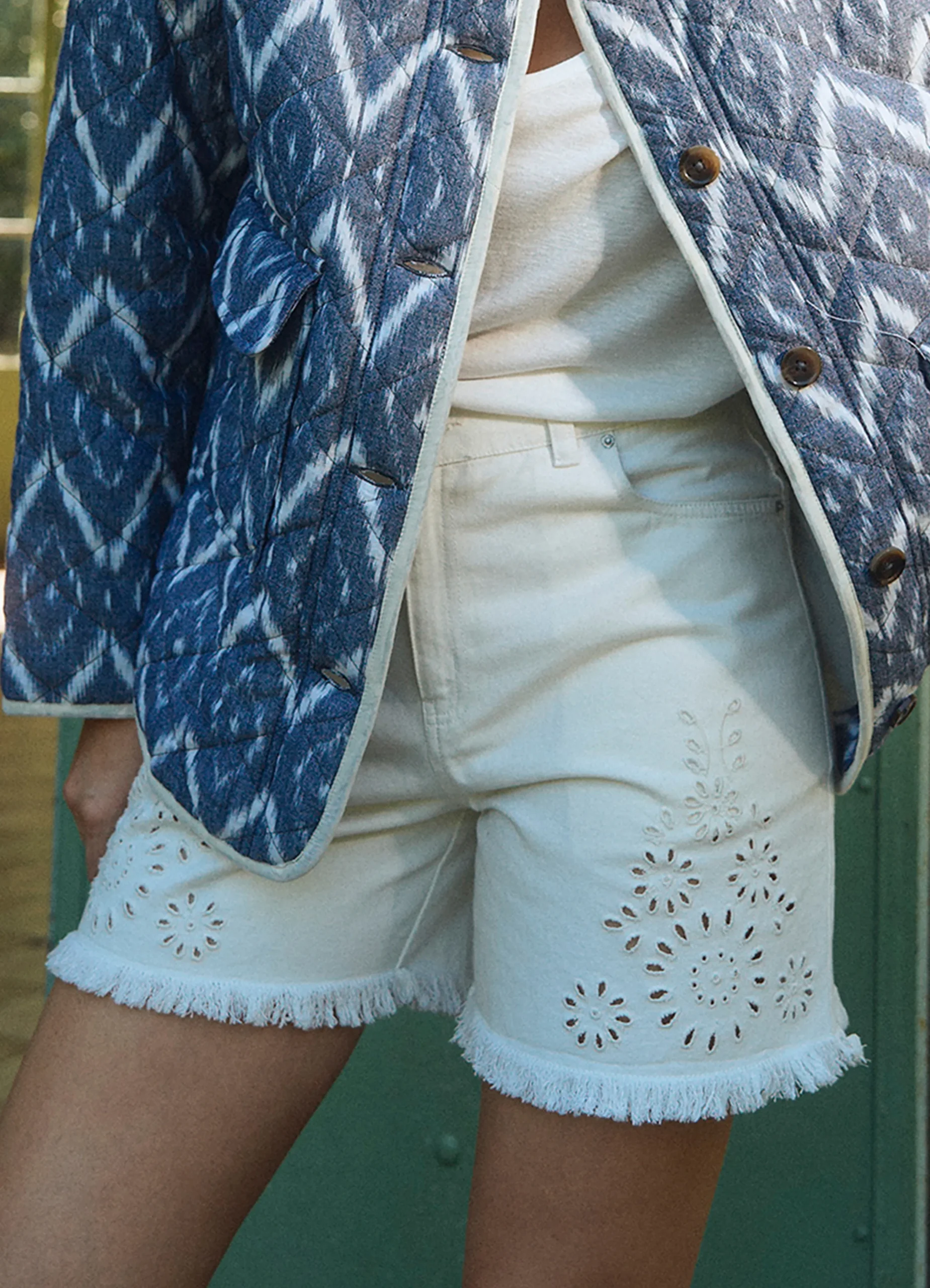 These high-waisted denim shorts are crafted from pure cotton and elevated with delicate broderie anglaise detailing for a feminine touch. Designed with side pockets and back patch pockets for everyday practicality, they feature a fringed hem that adds a relaxed, modern edge. A perfect blend of casual and romantic styling.