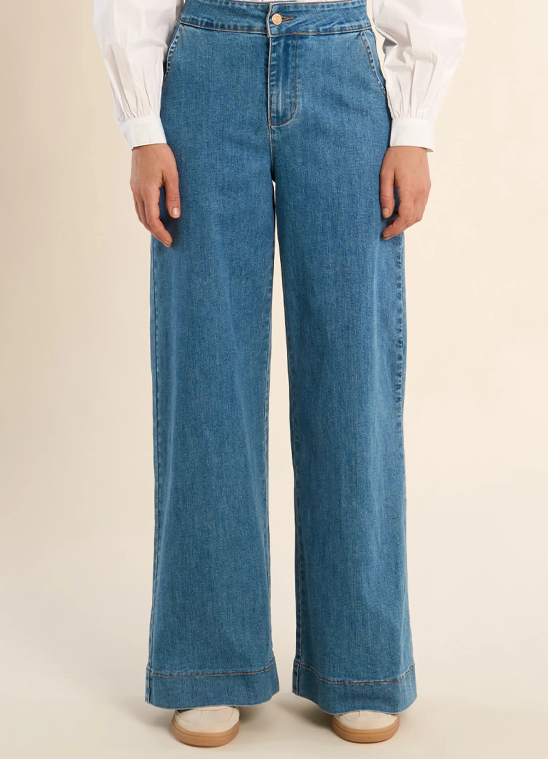 These high-waisted wide-leg jeans offer a flattering and modern silhouette. Designed with functional side pockets and a classic zip and button closure, they combine practicality with effortless style. The structured yet comfortable fabric ensures ease of movement while maintaining a polished look, making them a versatile choice for everyday wear.