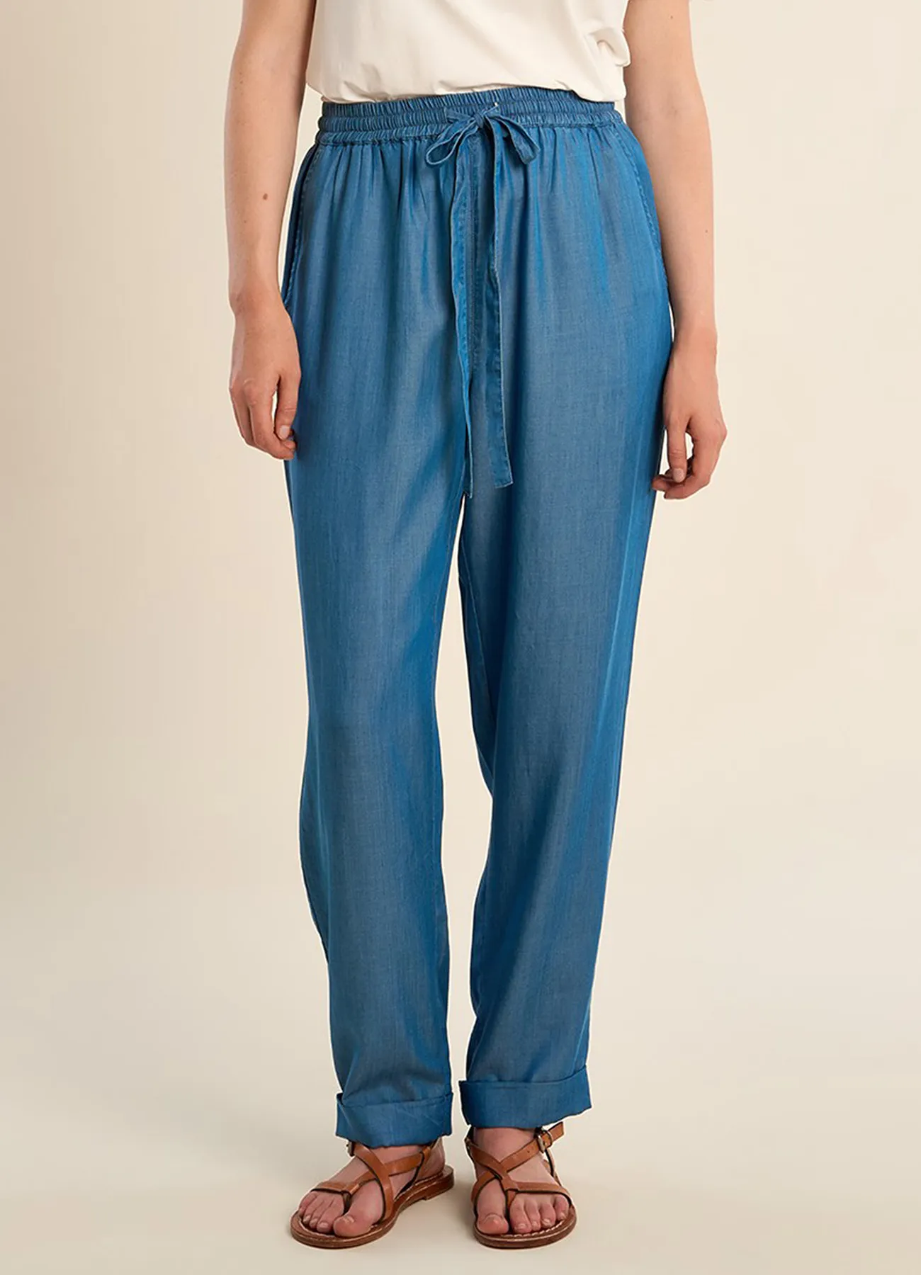 These carrot-cut pants combine modern tailoring with effortless comfort. Crafted from soft, fluid lyocell, they feature a high waist defined by an elasticated band with a tie belt, side pockets, and back patch pockets for practicality. The relaxed fit and smooth drape make them a versatile, polished addition to any wardrobe.