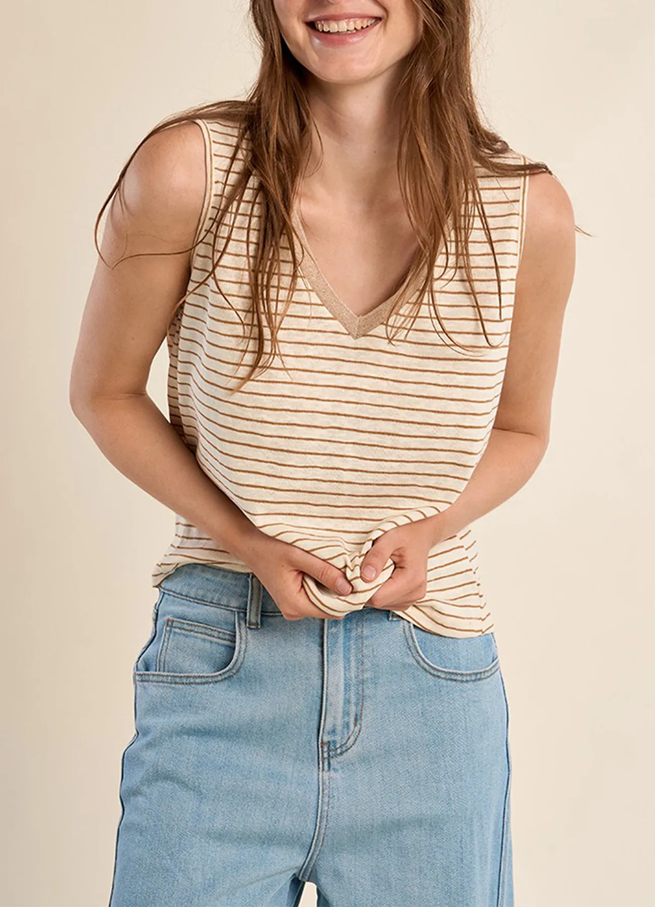 This tank top blends classic nautical inspiration with modern style. Designed with wide straps and a V-neckline accented with subtle gold detailing, it features a straight fit and comfortable length for effortless wear. The soft, breathable fabric ensures all-day comfort, making it a versatile addition to your wardrobe.