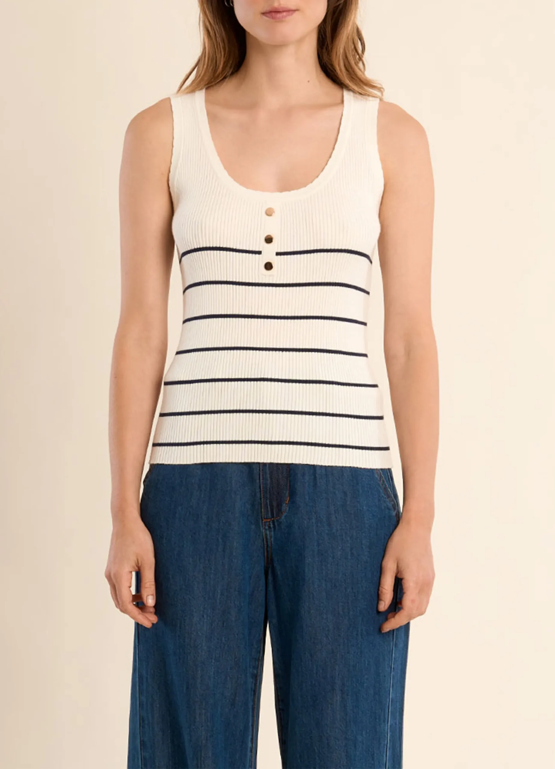 This ribbed sailor-style tank top features a classic round neckline and gold decorative buttons on the front, adding a chic and refined touch. Its fitted design combines comfort with a timeless nautical-inspired style.