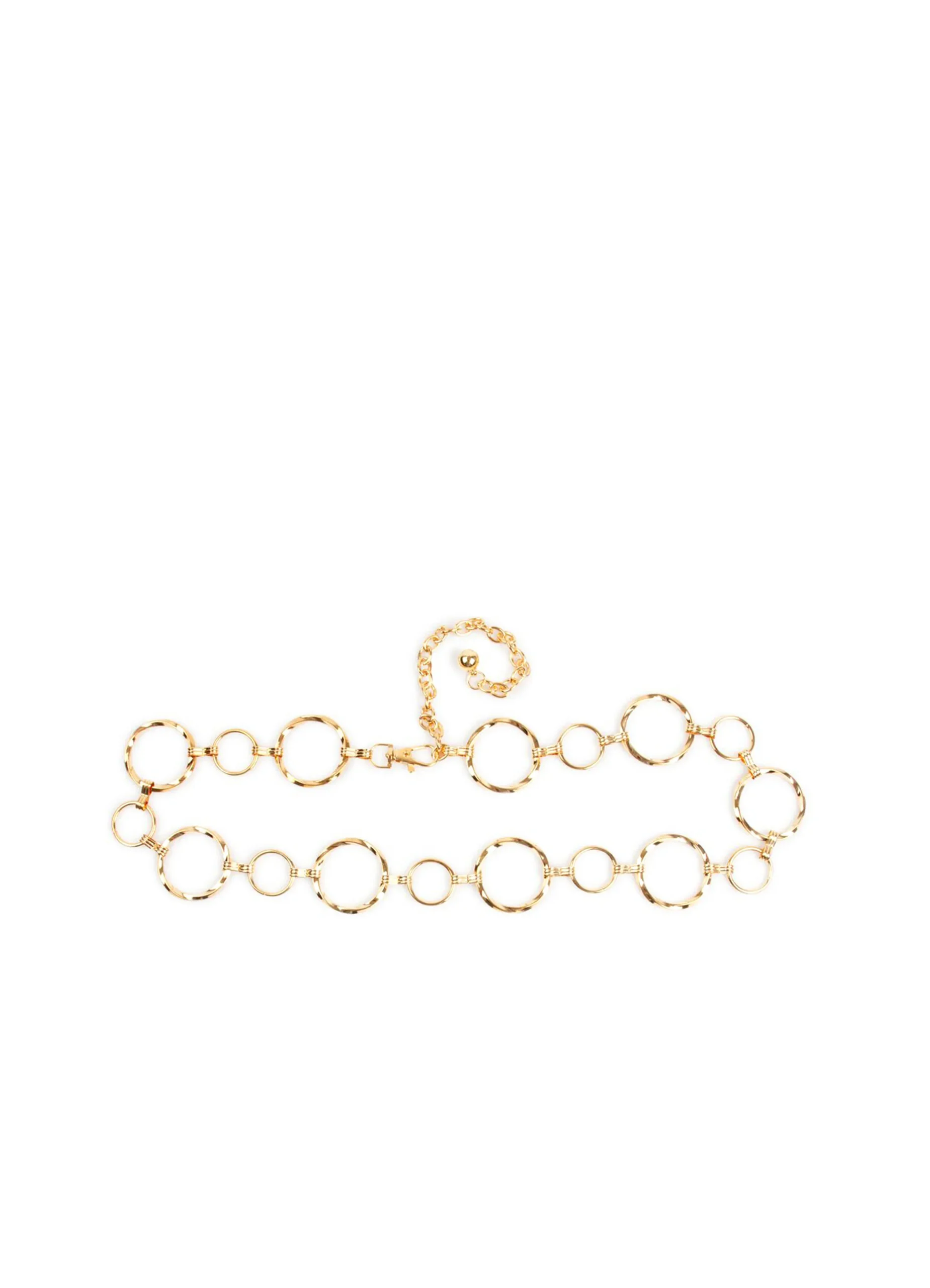 This belt combines modern edge with sophisticated design. Featuring a row of metal rings along its length, it is finished with a hook clasp fastening and chain for a chic, contemporary touch. A statement accessory that effortlessly elevates any outfit.