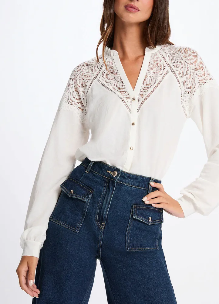 This lace blouse embodies modern and delicate femininity with a chic, timeless appeal. Designed with a straight cut to flatter all body shapes, it features a classic V-neck and long sleeves for an elegant silhouette. Subtly placed buttons add a refined detail, enhancing the sophisticated look, while the lace fabric brings a soft, feminine touch—perfect for elevated everyday wear.