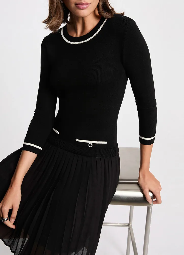 This short, straight dress blends femininity and modernity with chic pleated details. Delicate buttons add a refined touch of elegance, perfect for a polished and sophisticated look. The straight cut subtly enhances the silhouette, while the length flatters the legs for an effortlessly stylish finish.