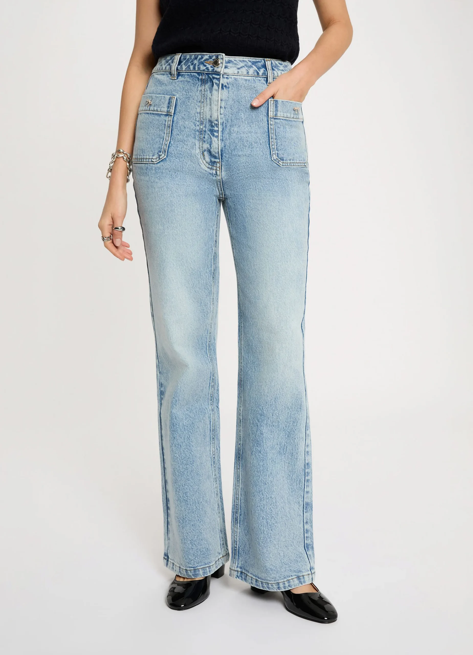 These wide-leg jeans offer a modern and feminine silhouette, with a high waist that elegantly shapes the figure while providing a structured yet comfortable fit. Perfect for versatile styling, they bring a casual-chic touch to everyday outfits.