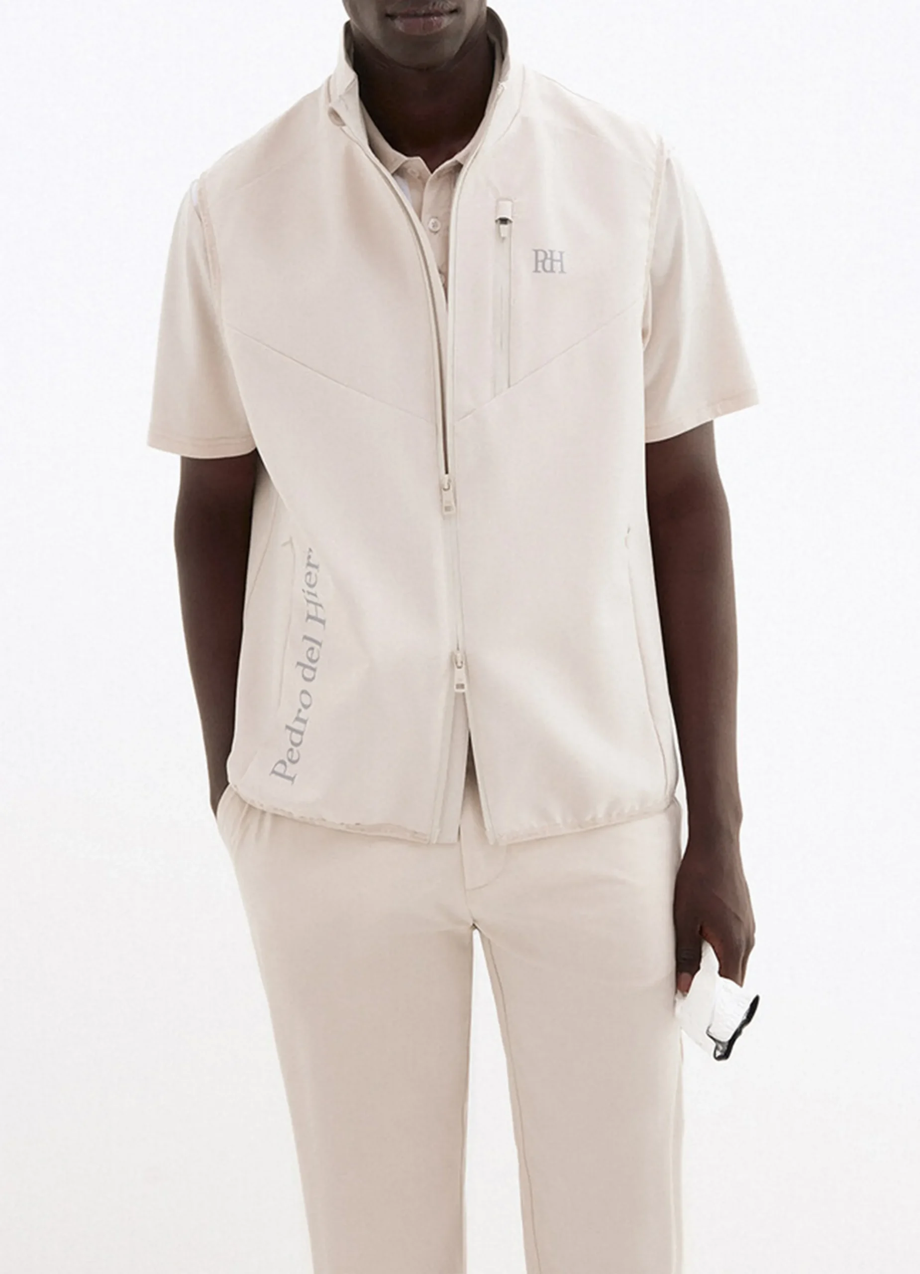 Golf vest featuring a front zip closure with a rubberized PDH logo, WIND PROOF insulation to protect against the cold, WATER REPELLENT fabric that creates a breathable barrier against moisture while prolonging fabric life, and THERMOLITE® padding made from 100% recycled PET bottles to retain heat and provide sustainable warmth.