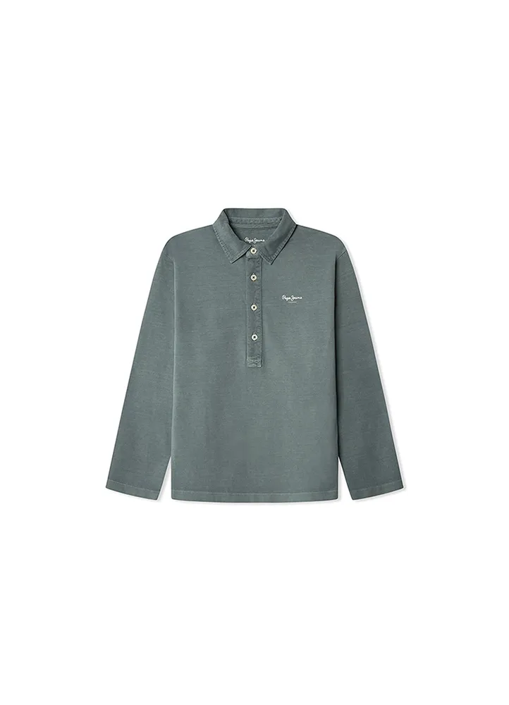 Long sleeve polo shirt with four buttons placket, and logo print on the chest.
