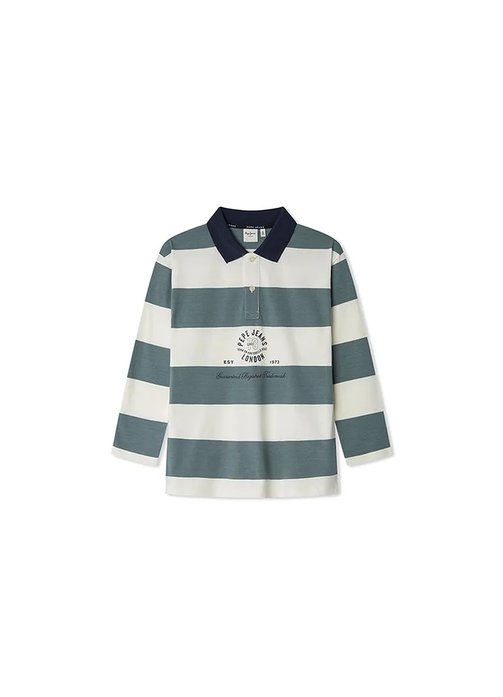 Long sleeve, striped polo shirt featuring a contrast collar, and bold front and back logo prints in contrasting colors.